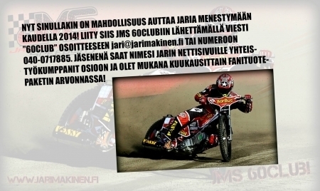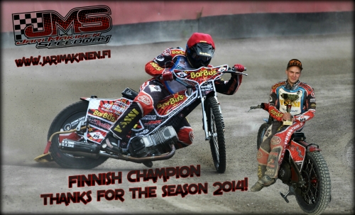 Now when season 2014 has ended, it's time to thank all partners, supporters and all who has been with us during the season. Jari's season was succesful after leg injury in 2013. Highlight of the season was winning Finnish title in Seinäjoki. Jari rode also in SM-liiga, Kaupunki Cup, Allsvenskan, Swedish 1. division and individual meetings. JMS wants to thank for season 2014 and hope to see you again in 2015!