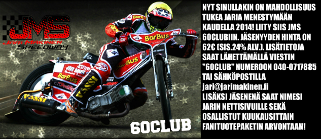 Kun kauden 2014 kilpailut on nyt ajettu, on aika kiittää kaikkia tukijoita, yhteistyökumppaneita, kannattajia, sekä muita kauden aikana mukana olleita. Kausi oli menestyksekäs, viime kauden loukkaantumisen jälkeen. Kausi huipentui henkilökohtaiseen Suomenmestaruuteen Seinäjoella. Lisäksi Jari ajoi SM-liigaa, Kaupunki Cupia, Allsvenskania, Ruotsin 1.divisioonaa, sekä henkilökohtaisia kilpailuja. JMS kiittää kaudesta 2014 ja nähdään taas 2015!